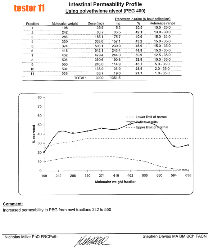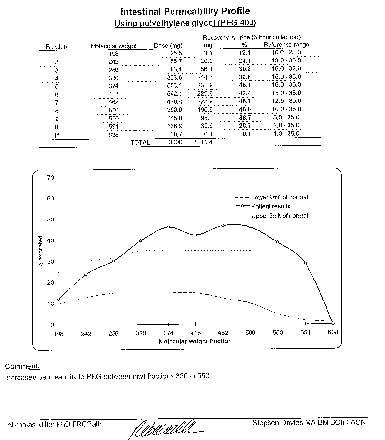 - Gut Permeability Profile (using PEG 400 as a probe and measuring all urine passed for the following 6 hours at 11 different molecular weights to establish the quantity of each absorbed through the gut wall). [Refs]