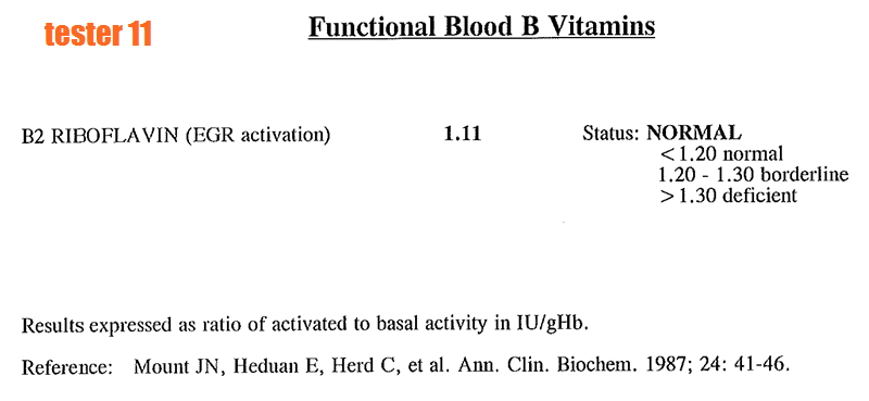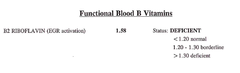 - Functional B vitamins profile (see also functional blood profile), focus on Riboflavin (B2) - by measuring the activation of a red cell enzyme that is dependent upon an adequate concentration of a particular vitamin for full activity. The assay relies on normal metabolism of the vitamin to its native form and the presence of other non-vitamin co-factors. [Refs]
