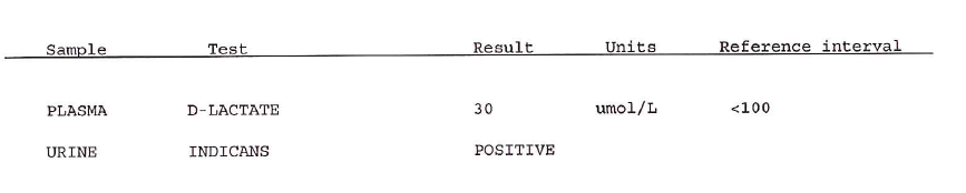 - D-lactate test (D-lactate is measured by centrifugal analysis using the specific enzyme D-lactate dehydrogenase, which does not react with L-lactate) [Refs]